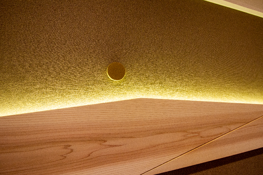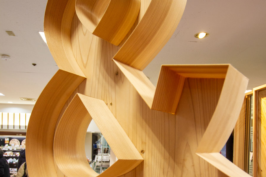 智頭杉は樹齢約400年の「慶長杉」と呼ばれる人工林があり、智頭町は吉野・北山に並ぶ歴史ある林業地として、全国的にも知られています。木目が均等に詰まった木質や、淡紅色に染まった心材など、その美しさは高く評価されており、伝統の技術を取り入れ、木の美しさと斬新なデザインで鳥取の風土・シンボルの特徴を『智頭杉』で表現しました。