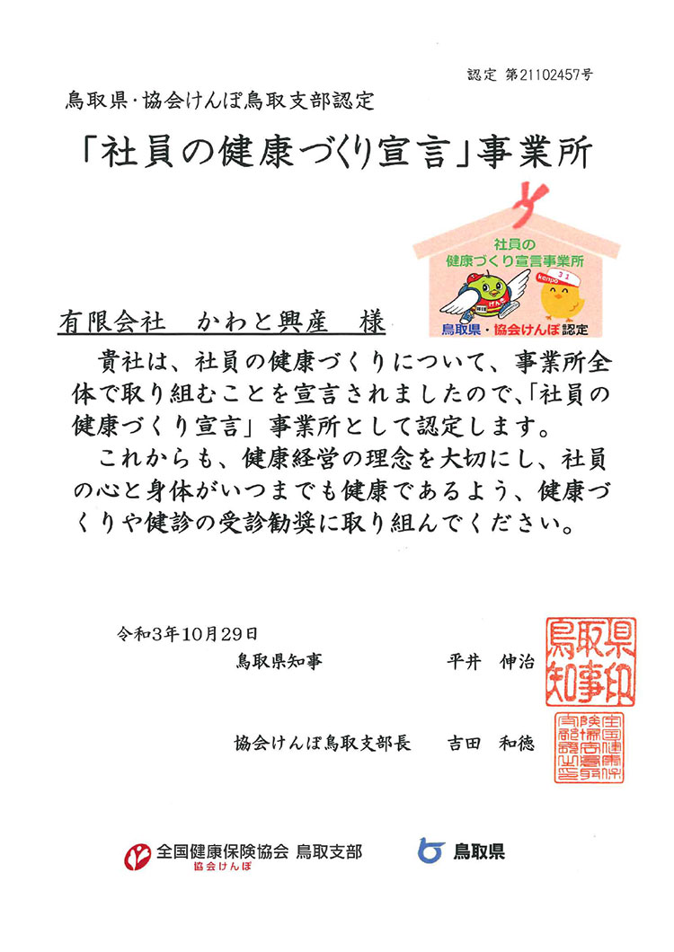 鳥取県が推進する「社員の健康づくり宣言」事業所認定